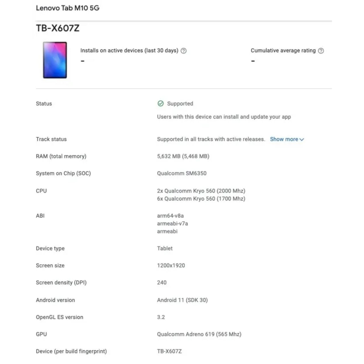 نسخهای که از تبلت لنوو Tab M10 در کنسول گوگل پلی لیست شده است، به ۶ گیگابایت حافظه رم مجهز است. بنابراین، تاکنون ۴ یا ۶ گیگابایت حافظه رم برای این تبلت تأیید شده است. استفاده از تراشه اسنپدراگون ۶٩٠ ۵جی و اندروید ١١ پایه نیز مجدداً تأیید شده است. به نظر میرسد که وضوح نمایشگر دستگاه جدید لنوو، برابر با ١٩٢٠×١٢٠٠ است. تراکم پیکسلی این نمایشگر ٢۴٠ پیکسل بر اینچ میباشد. مدل نامبر تب M10 5G در این تأییدیه نیز TB-X607Z است.