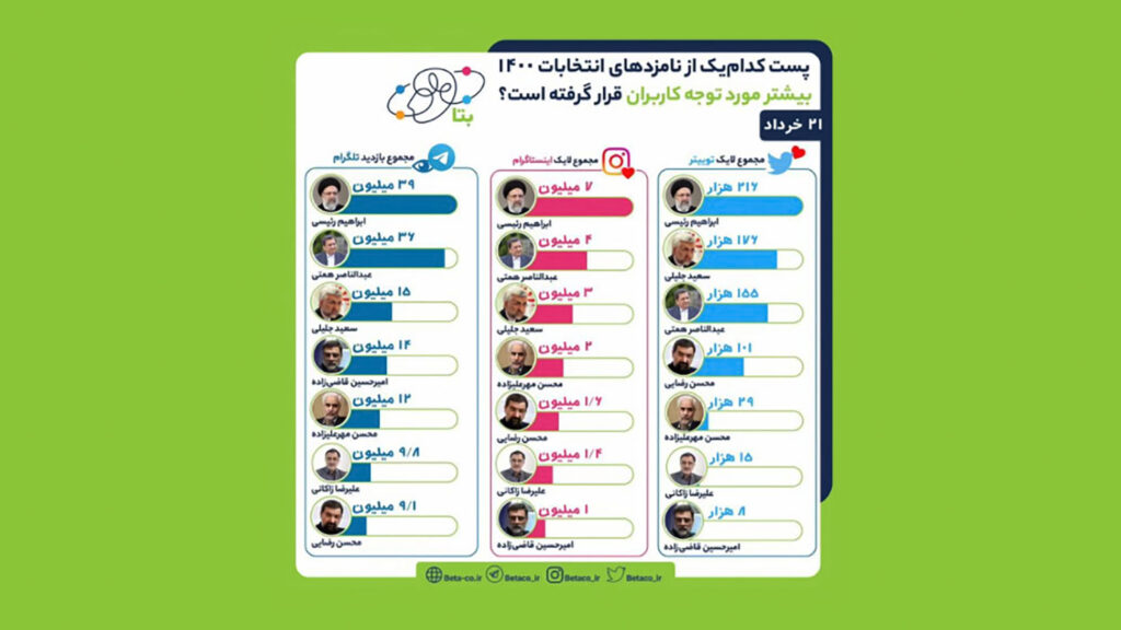 داده های مختلفی توسط مرکز پژوهشی بتا از شبکه های اجتماعی (با احتساب کانال های تلگرام در این دسته) در روز ۲۱ خرداد ۱۴۰۰ شده است. در این بین ۲ بررسی درباره “بیشترین تاثیر پست نامزدهای انتخاباتی پیش از مناظره سوم انتخابات ۱۴۰۰” و “تولید محتوا پیرامون نامزدهای انتخاباتی پیش از مناظره سوم انتخابات ۱۴۰۰” می تواند جالب توجه ترین ها باشد. اولین آن ها می تواند به محبوبیت و دومی به محبوبت و پرحاشیه تر بودن نامزدها اشاره کند.