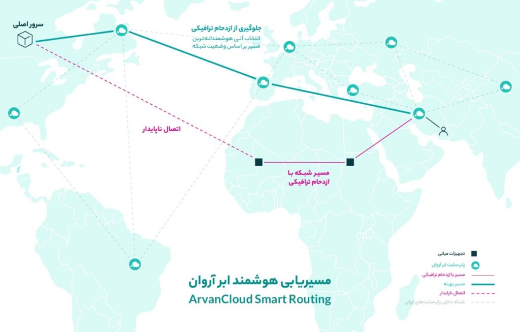 مسیریابی هوشمند در زمان ازدحام شبکه (Network Congestion) یا کندی ارتباطات، کاربر را بهشکل خودکار از مسیرهای جایگزین هدایت میکند تا با انتخاب بهترین و کوتاهترین مسیر برای انتقال درخواستها، تجربهی بهتری برای استفادهکنندگان نهایی فراهم شود.